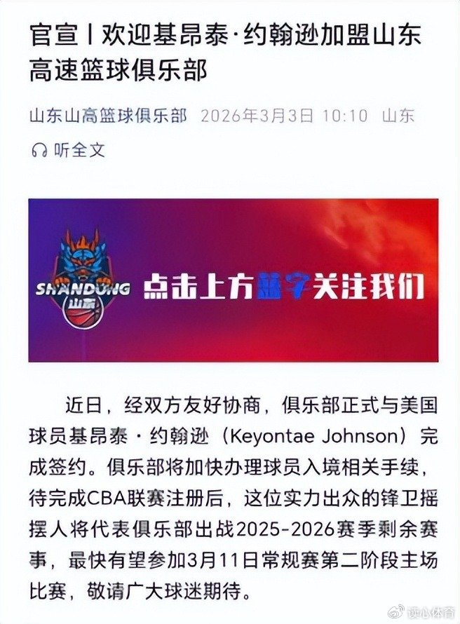 随着正月十五元宵节的到来,高速俱乐部也给球迷带来了好消息,山东高速已正式签下了1米95后卫基昂泰-约翰逊,目前俱乐部相关工作人员正在安排其办理签证及入境手续,能赶上第二阶段联赛首战。据跟队记者夏晓司透露,高速俱乐部与基昂泰-约翰逊就合同问题拉扯近两周,直至签约前的一天还在不断修改合同细节,邱彪指导甚至一度以为无法签下基昂泰-约翰逊,另外敲定了备用外援人选,最终好事多磨,基昂泰-约翰逊还是在山东高速给出的合同上签字。如今外线有了基昂泰-约翰逊与珀塞尔轮换,内线有克里斯与琼斯护框,少赛1场暂排第五的山东高速第二阶段将朝着更高目标发起冲击。