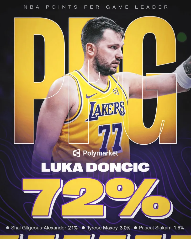 “据Polymarket预测,卢卡-东契奇将赢得本赛季NBA得分王”,Legion Hoops附文道。